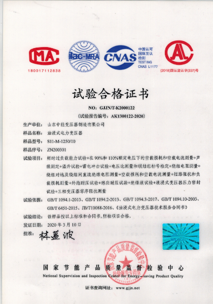 國(guó)家節(jié)能產(chǎn)品質(zhì)量監(jiān)督檢驗(yàn)中心 查詢(xún)編號(hào):AK1300122 查詢(xún)備案證書(shū)號(hào):GJJN-B-K2000122 批準(zhǔn)日前:2020-03-10 公司名稱(chēng):山東中能變壓器制造有限公司